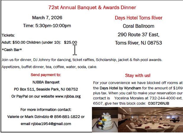 On March 18 2023, we reinstituted our Annual NJBBA Banquet. It was our 69th year and we celebrated at the New Egypt Elks Lodge #2457. We had a little over 60 members come out enjoy the fine festivities. There were two Scholarship Awards presented, Megan Woods and Alexandra McGinley were recipients. Fish pool winners were announced but not in attendance. Francis ‘Paco” Wagner and Ron Woods Jr each received their one star jackets. Ken Hollins and Bill Mackintosh received their six star jackets. Valerie Dzindzio received a plaque for becoming a life member. There was a 50-50, door prizes, assorted raffles including a lottery for a pot of gold and grand prizes, food, music and friendship. Shawn Hardy did an outstanding job providing the music for dining and dancing. The food was excellent and we had a cake complete with a sandy beach along with tire tracks on top, cookie trucks and waves on the edges. The cake and cookies shaped like trucks were enjoyed by all. What a wonderful night! Thanks to all who helped organize this event and to all who came out. Next year, we celebrate our 70th Anniversary of NJBBA! Hope to see everyone there! by Mark, and Valerie Dzindzio Pictures below, more on Facebook and click below